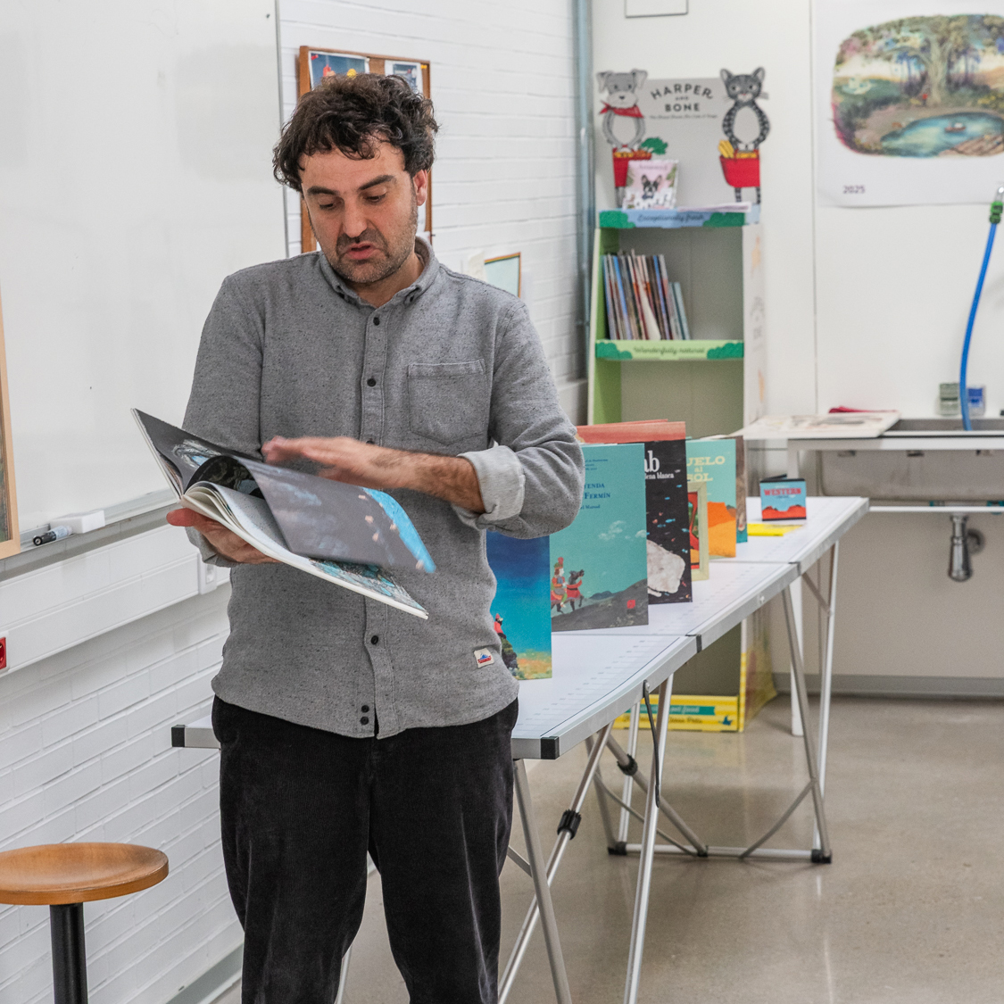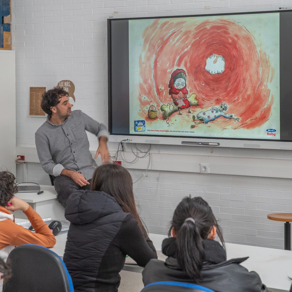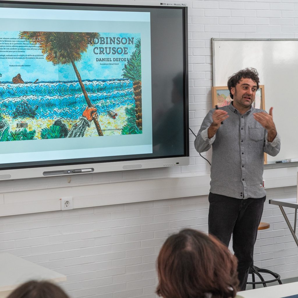 Durante su intervención, Manuel Marsol ofreció una exposición detallada de su trayectoria profesional y su proceso de creación, acompañada de una muestra de sus obras y publicaciones. Su ponencia permitió a los asistentes conocer de primera mano las fases de desarrollo de un proyecto ilustrado: desde la concepción inicial de la idea hasta la materialización editorial, incluyendo la relación entre texto e imagen y las técnicas plásticas que definen su estilo.